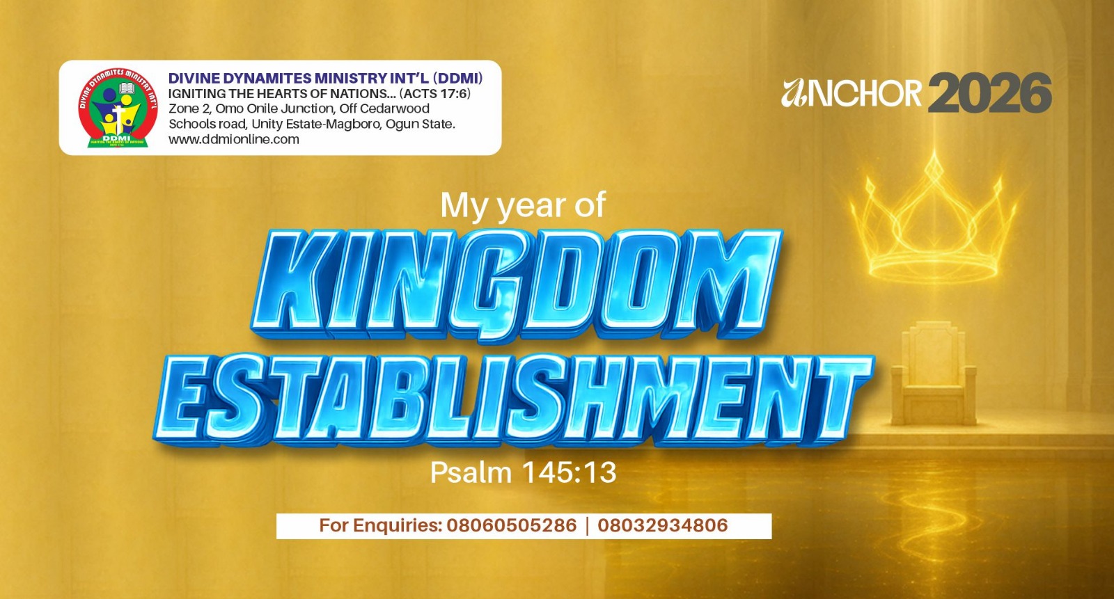2026 is a defining year for Divine Dynamites Ministry International (DDMI). Following the Year of Supernatural Manifestations (2025), the Lord is leading the ministry into a season of Kingdom Establishment, a year where what God has revealed, released, and manifested will now be built, strengthened, governed, and sustained.