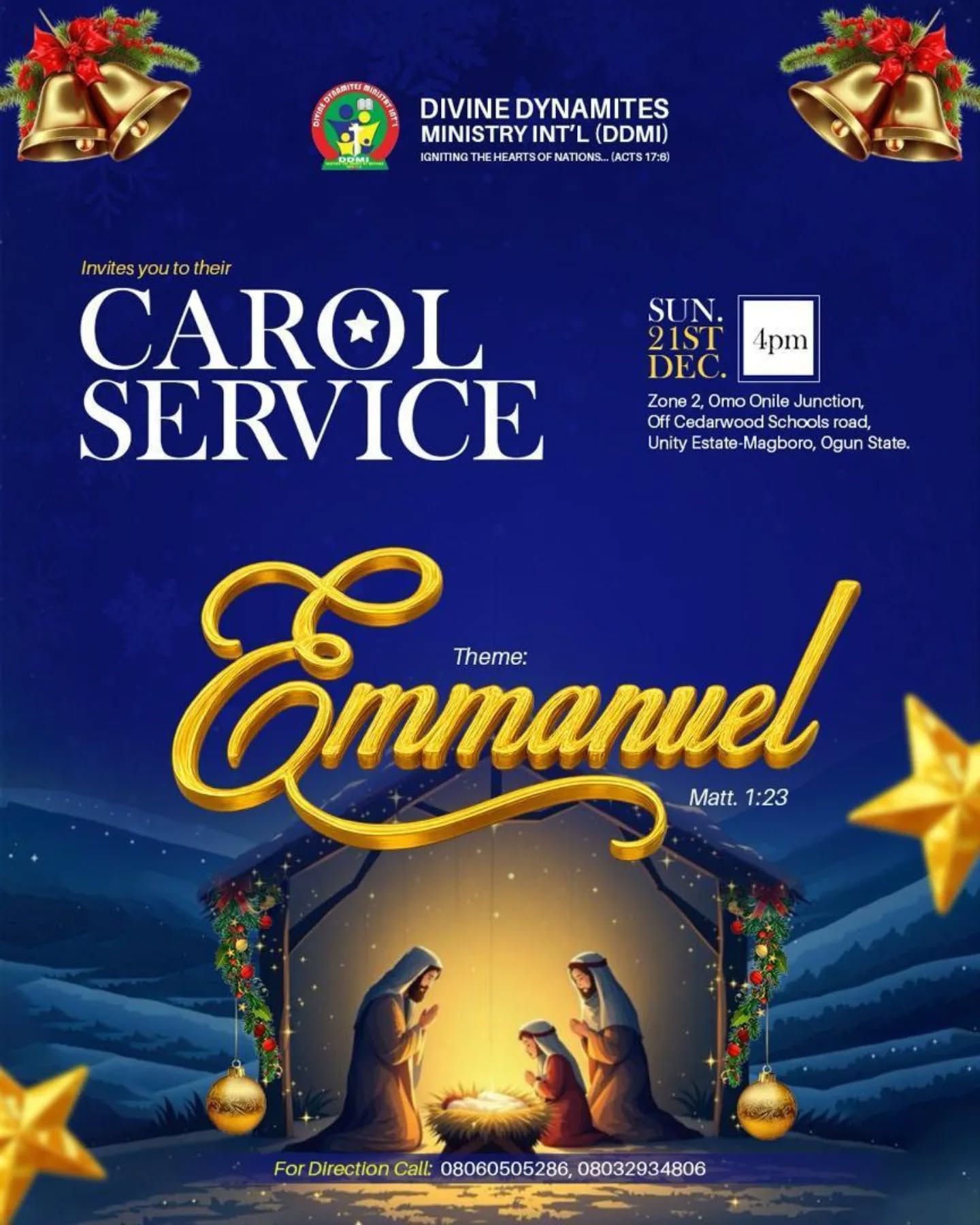 Divine Dynamites Ministry Int’l (DDMI) warmly invites you to a joyful Christmas Carol Service as we celebrate Emmanuel — God With Us (Matthew 1:23).